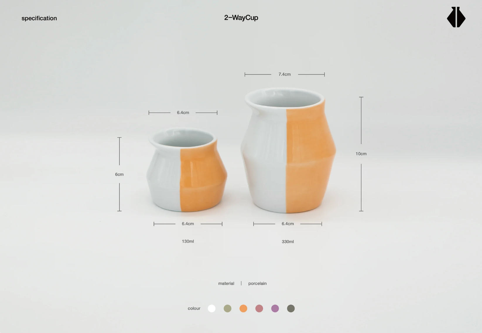 The 2-WayCup came in two sizes. The smaller cup (130ml) is perfect for enjoying espresso or sharing filter coffee, tea, or sake. The larger cup (330ml) is designed for savoring a full cup of coffee, like filter coffee or an Americano. Additionally, the cup colors can serve as a visual cue, helping you associate them with flavors of foods that share similar colors.