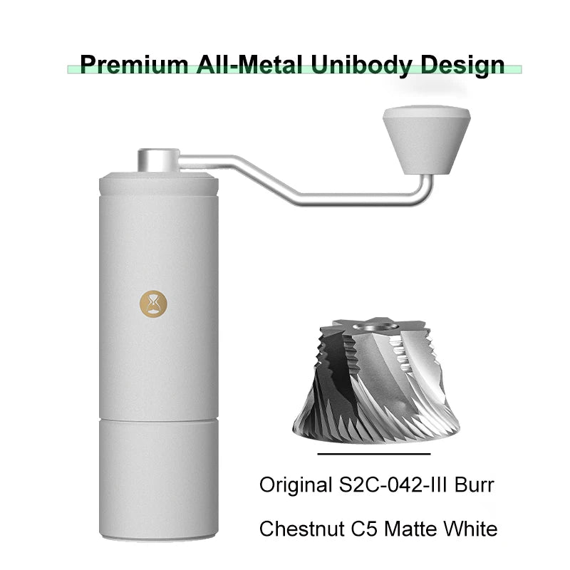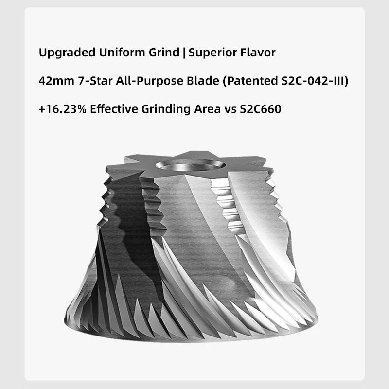 Upgraded to the S2C-042-III 42mm conical burrs, offering faster and more consistent grinding compared to the previous 38mm set.